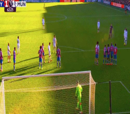这是曼联的任意球机会,B费做球,芒特禁区外右脚劲射破门,曼联2-1!