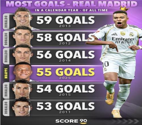 本赛季皇马这条锋线最大的话题,就是姆巴佩在自然年进球上疯狂追赶C罗的历史纪录。如今他已经为皇马打进55球,...